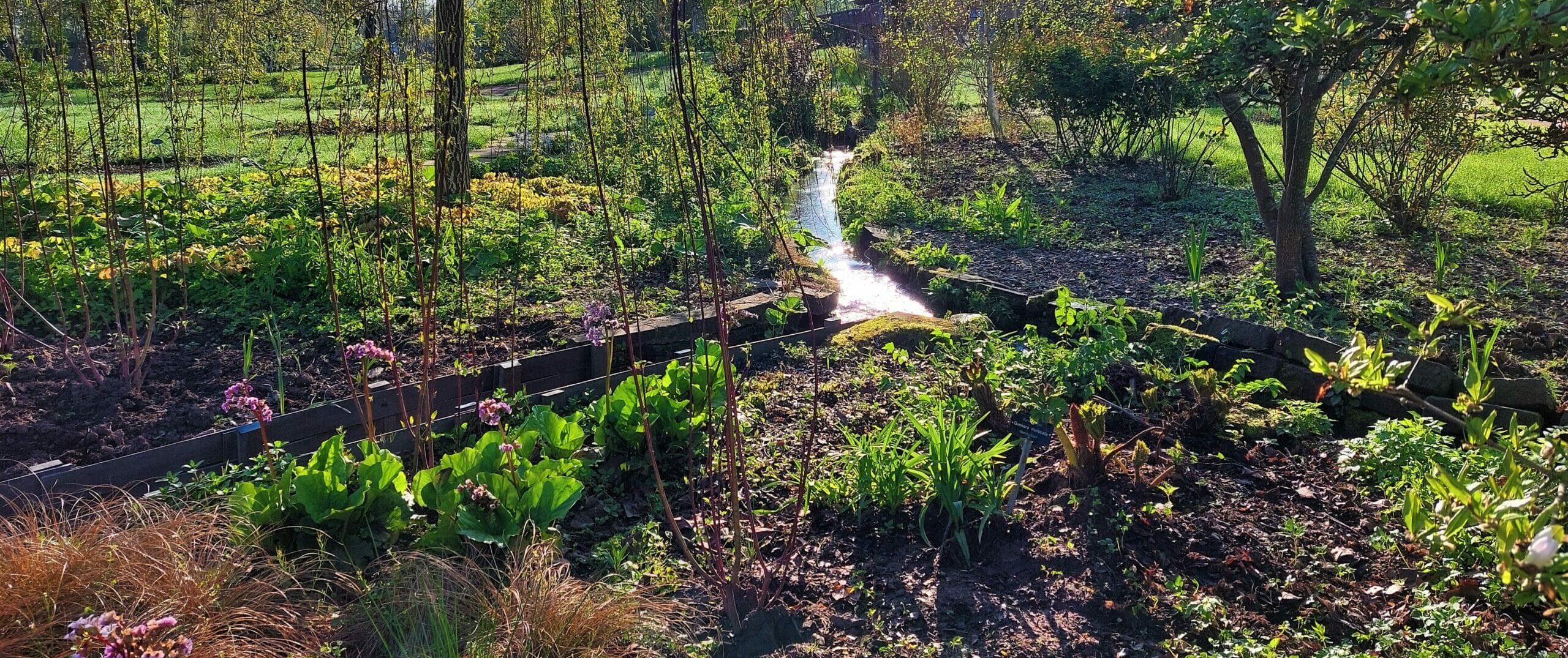 Ein Abzweig des Bleicherbaches, der den Garten im Osten begrenzt, schlängelt sich durch den Garten und speist schließlich den Spiegelweiher. Immer wieder führen kleine Brücken über den Bach und ermöglichen so das glitzernde Band zu verfolgen und die abwechslungsreich gestalteten Ufer zu entdecken. Wo das Ufer in Wiesenstücken zugänglich ist, lockt das gurgelnde Bächlein zu spielen. Lassen Sie sich von zahlreichen Ideen für die Ufer-Bepflanzung inspirieren.